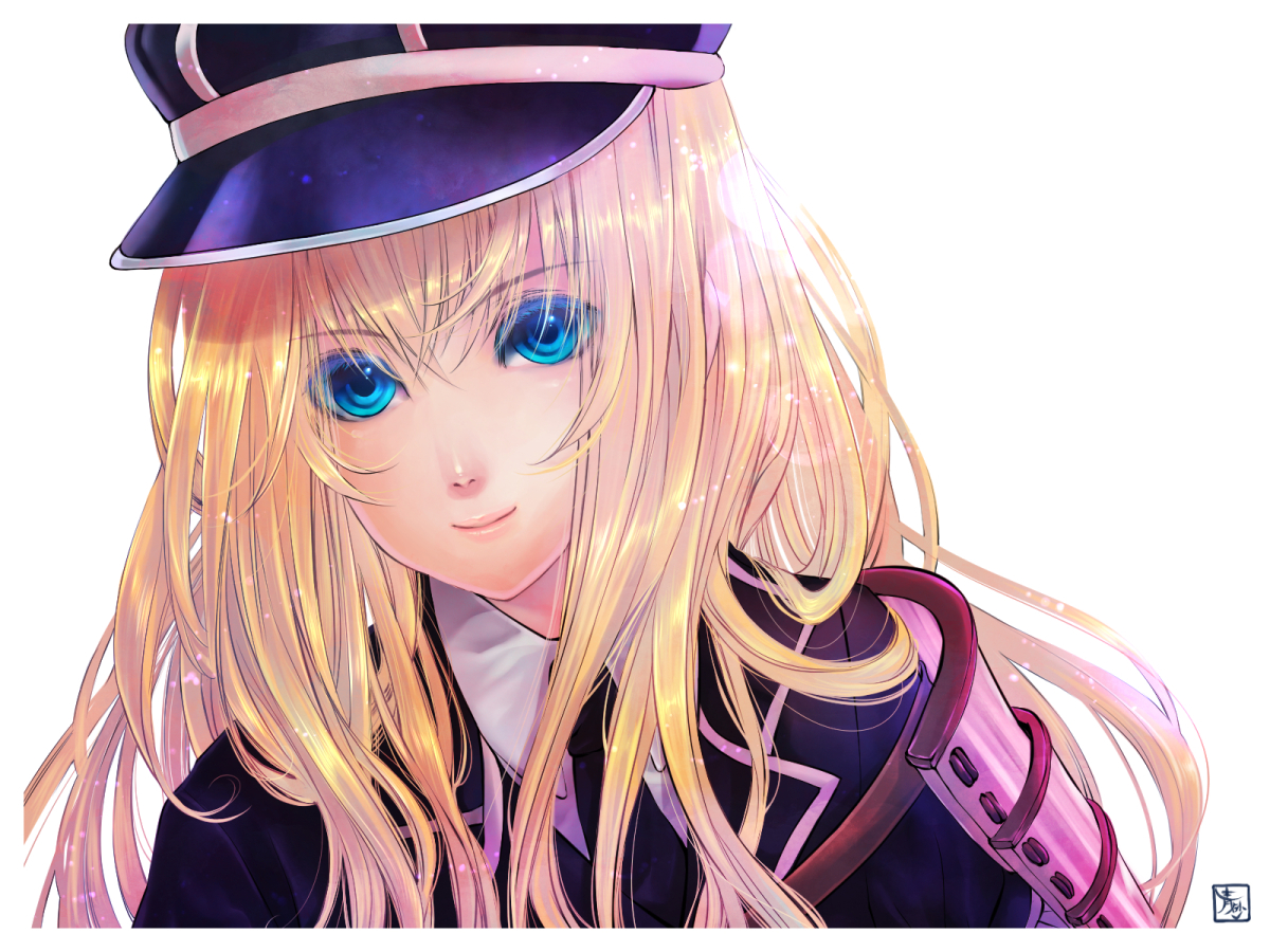 Description: A anime girl with long blonde hair wearing a hat and a blue eyes and a black jacket and hat.