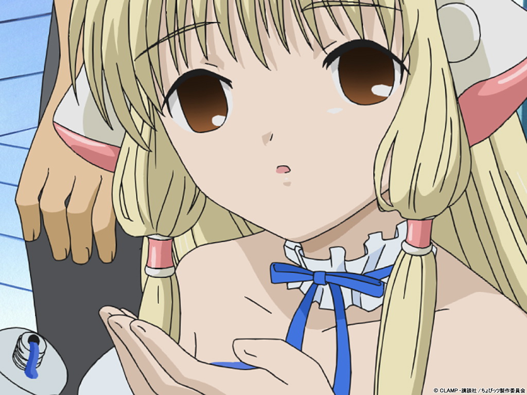 Description: A anime girl with long blonde hair and big eyes holding a cell phone in her hand and looking at the camera.
