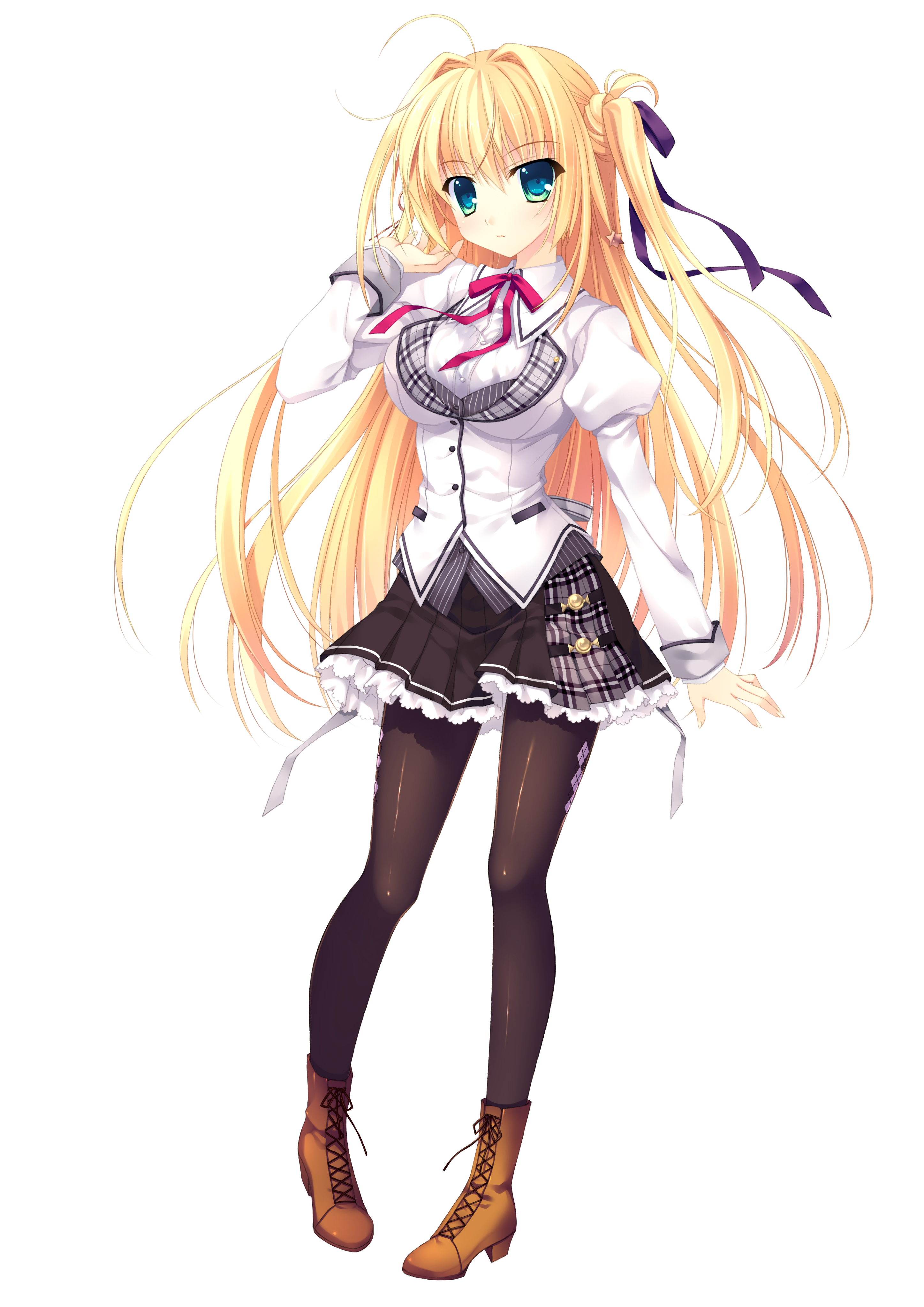 Description: A anime girl with long blonde hair and a white shirt and black pants and boots.