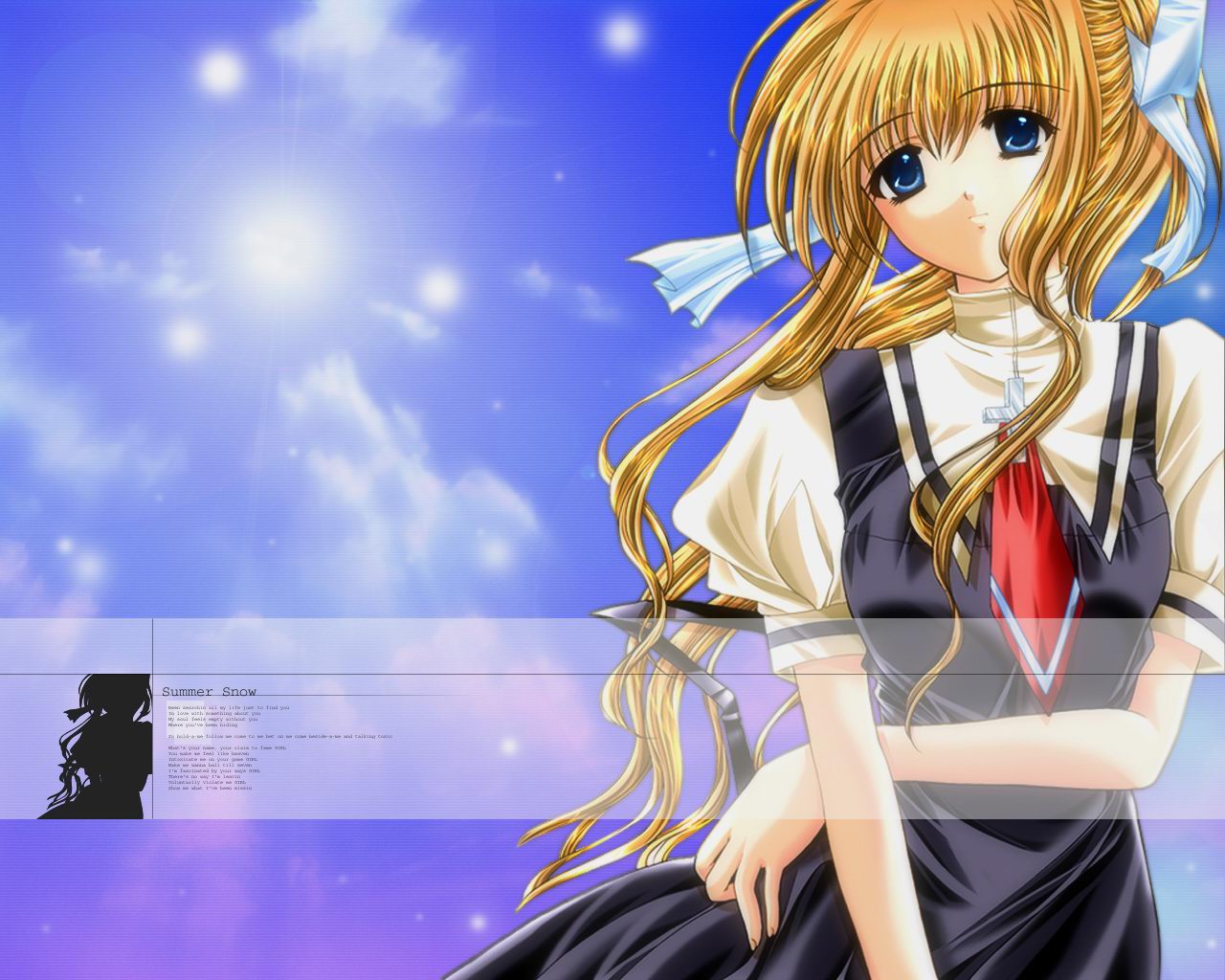 Description: A anime girl with long blonde hair and a red tie is standing in front of a blue sky with stars.