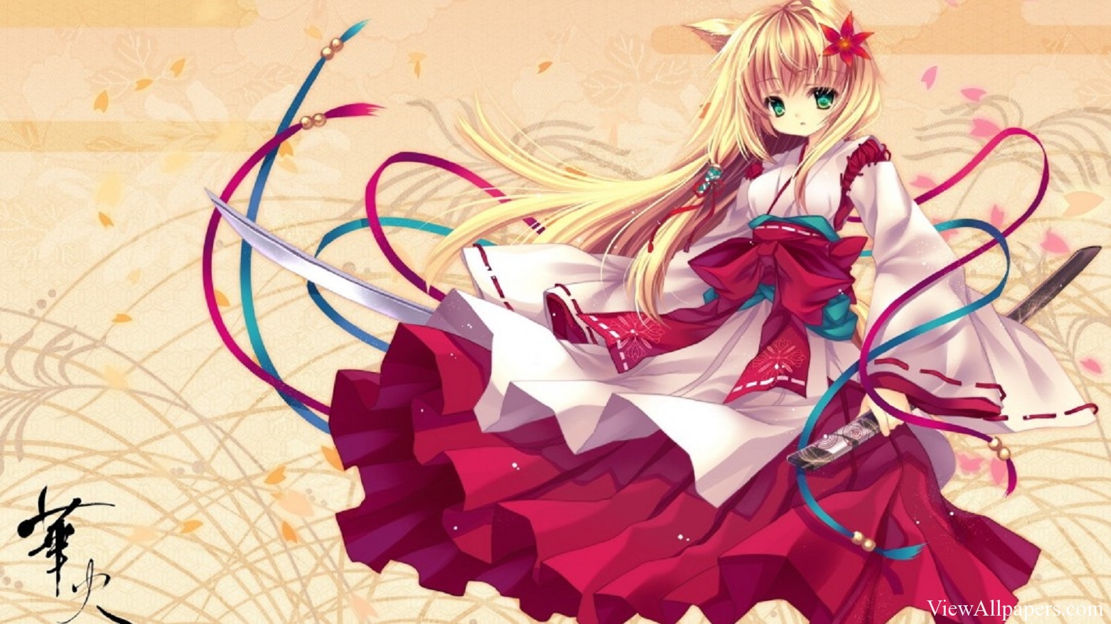 Description: A anime girl with long blonde hair and a red dress is holding a sword and a pink background with a floral design.