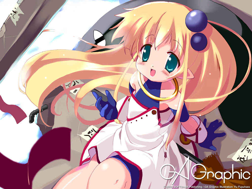 Description: A anime girl with long blonde hair and blue eyes is posing for a picture with music notes on her wall.