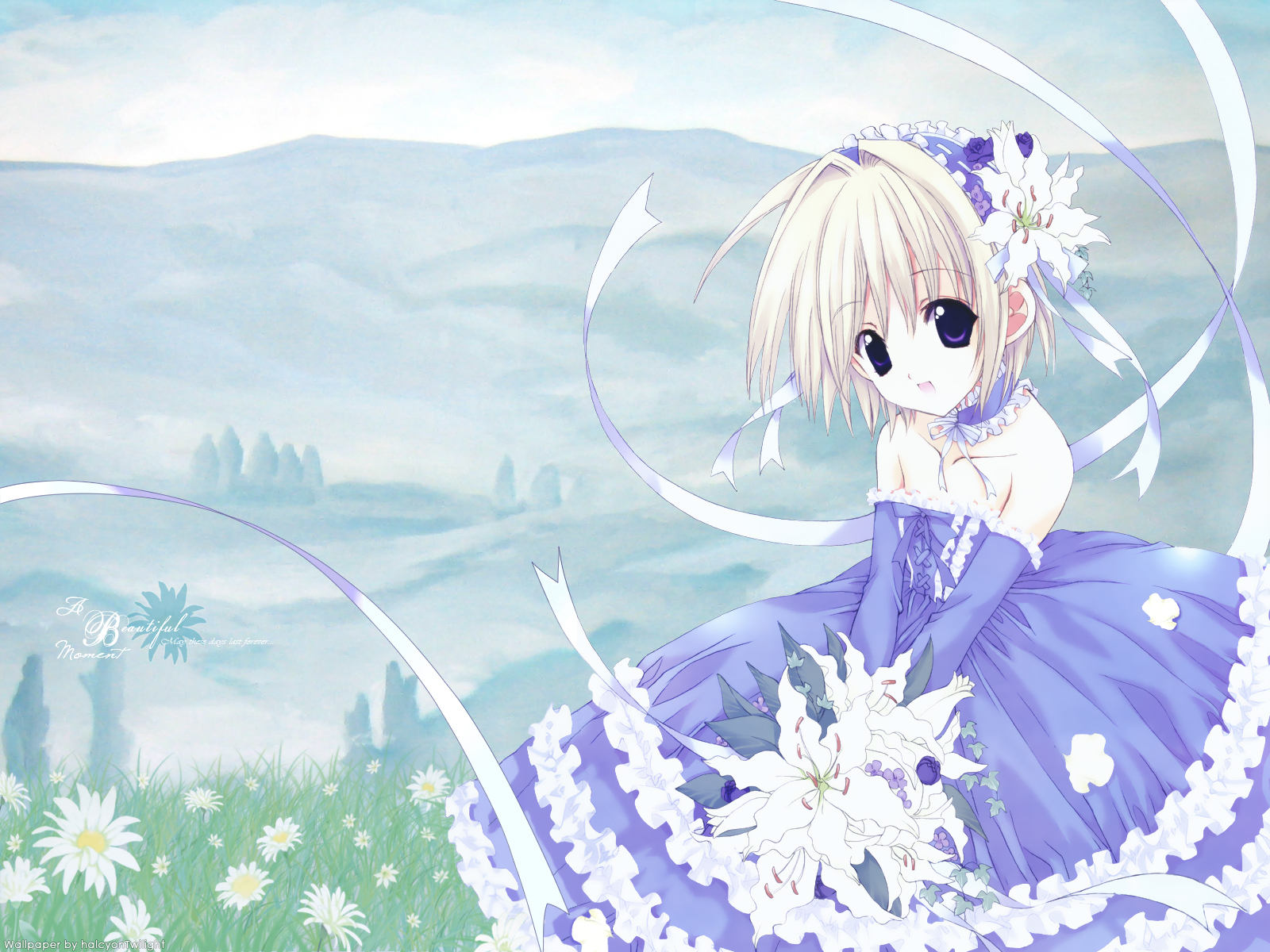 Description: A anime girl in a blue dress holding a bouquet of flowers in her hand and a mountain in the background.