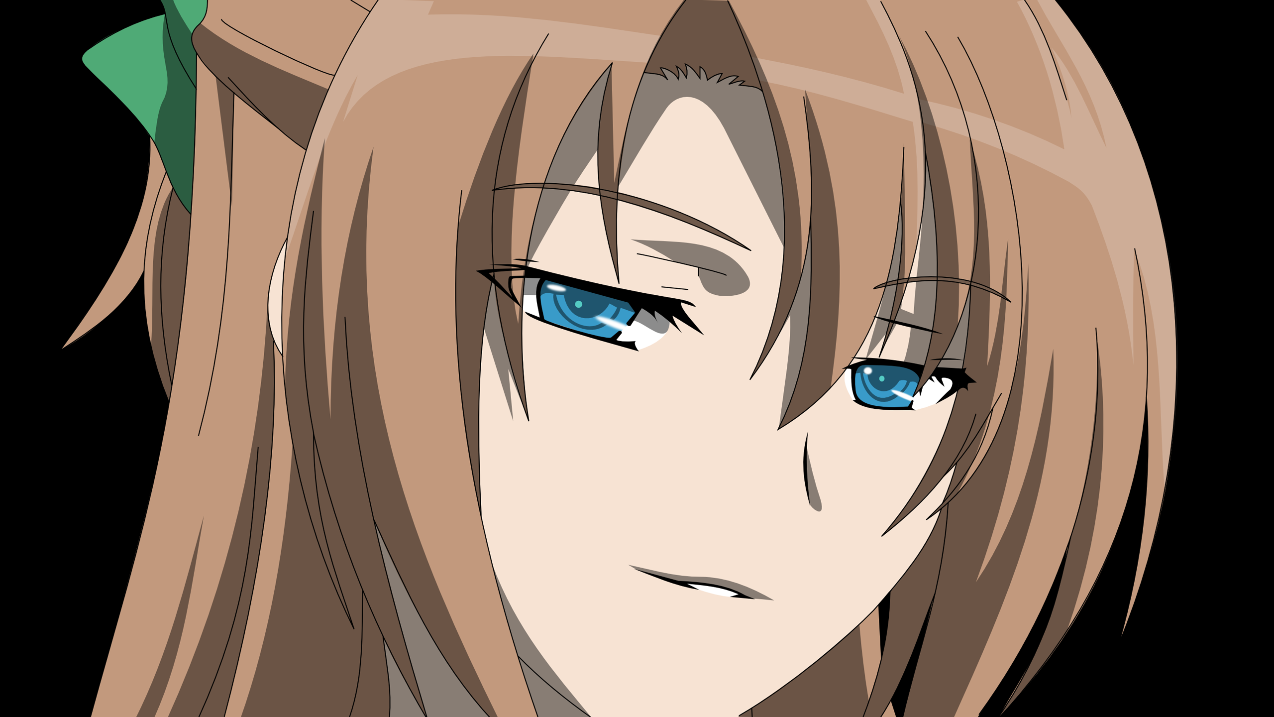 Description: A anime girl with blue eyes and long blonde hair with a green bow around her neck and a green bow around her neck.