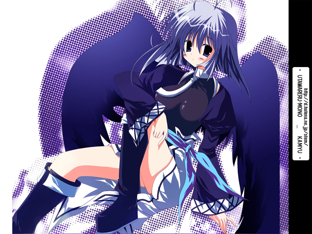 Description: A anime girl with long hair and blue eyes is posing for a picture with purple background and a white background.
