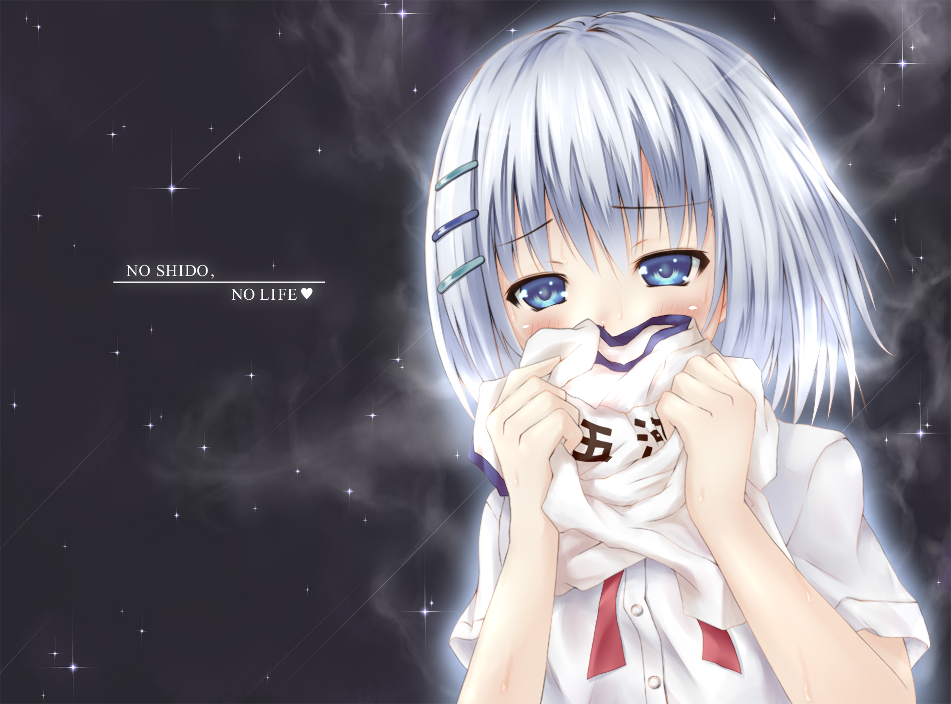 Description: A anime girl with blue eyes holding a white object in her hands and a black background with stars and a sky with stars.