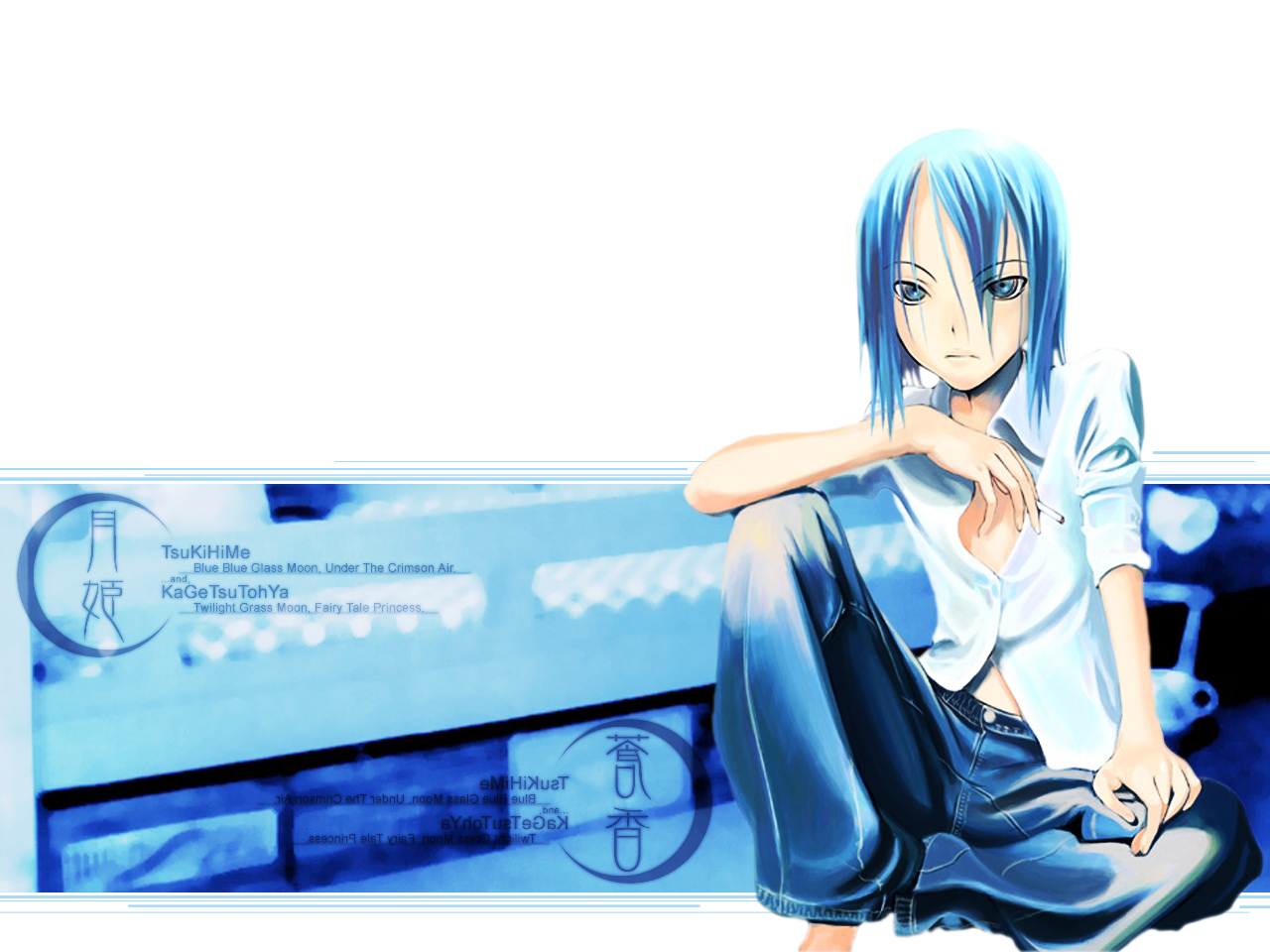 Description: A anime girl sitting on a bench with her arm on her knees and a sign behind her that says.