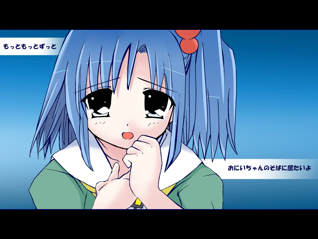 Description: A anime girl with blue hair and black eyes is looking at the camera with her hand on her chin.