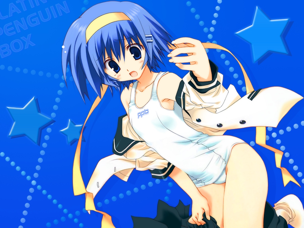 Description: A anime girl with blue hair and a white dress is holding a star shaped object in her hand and is posing for the camera.