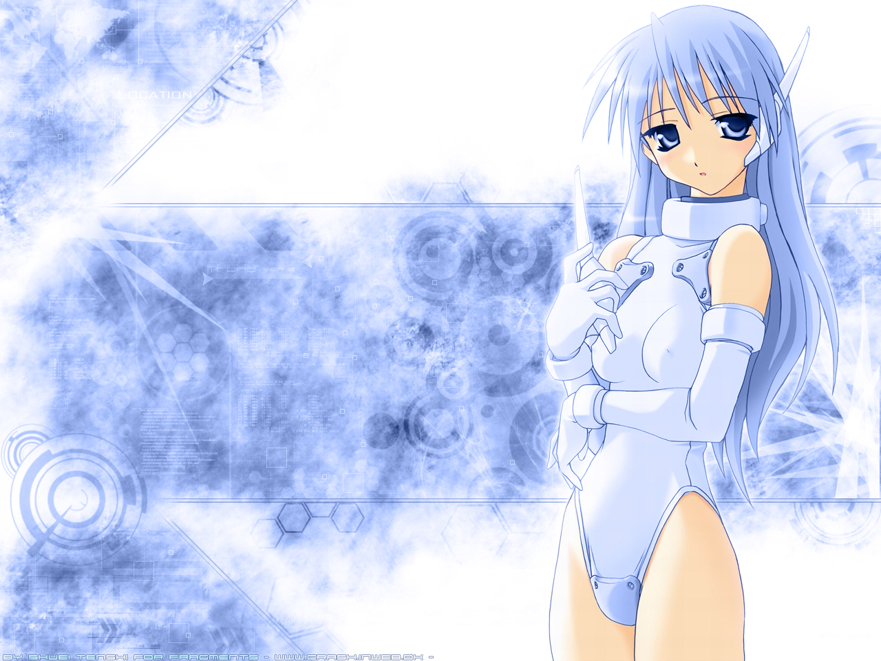 Description: A anime girl with blue hair and a white dress is standing in front of a blue background with a white background.