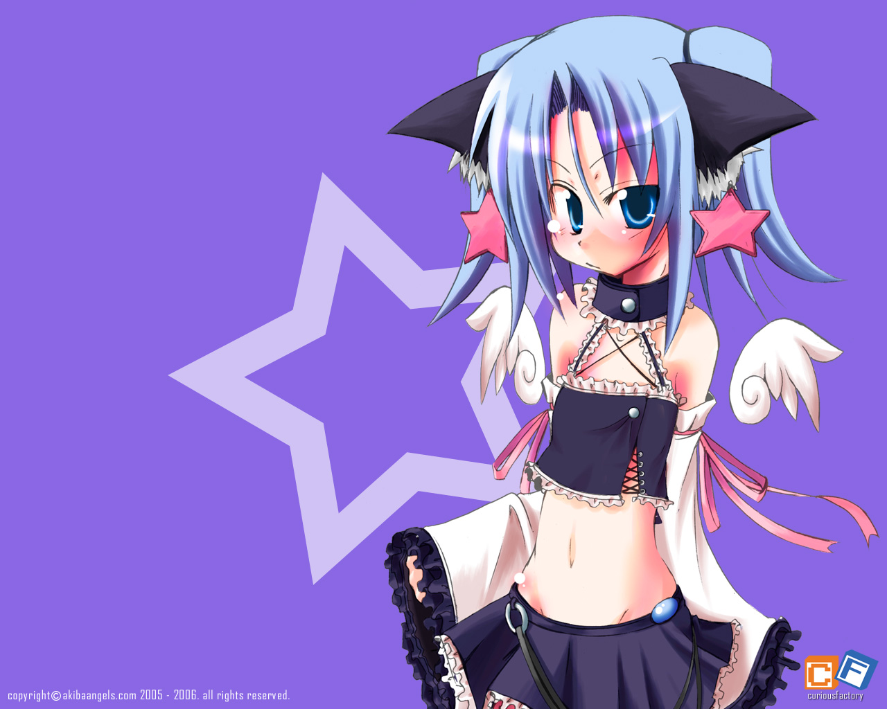 Description: A anime girl with blue hair and a black outfit with wings and a star on the background with a purple background.