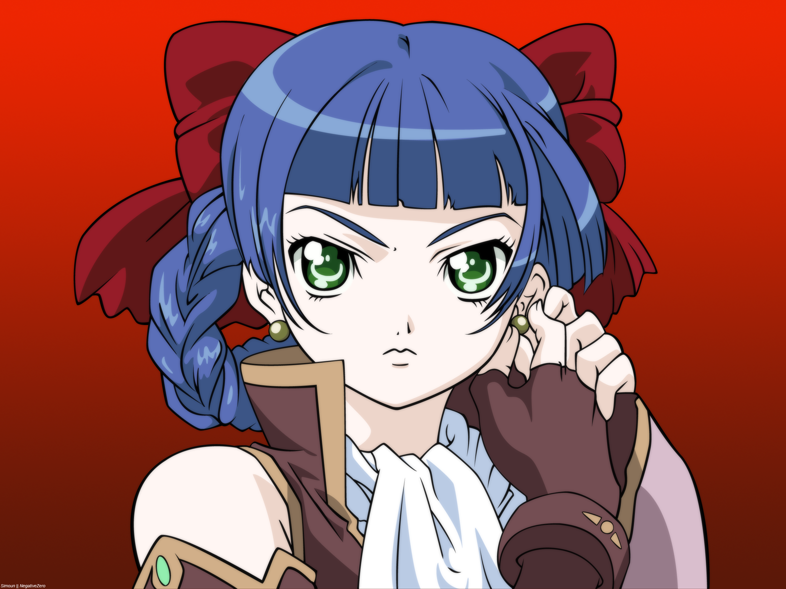 Description: A anime girl with blue hair and green eyes with a red background and a red background with a red background.