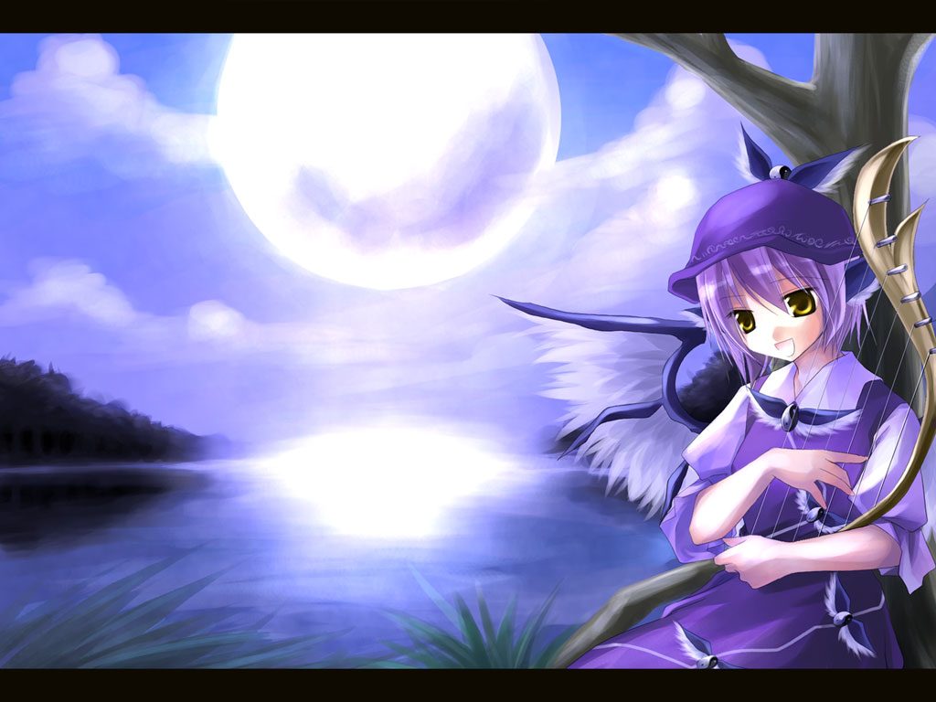 Description: A anime girl with a bow and arrow in her hand near a lake with a full moon in the background.