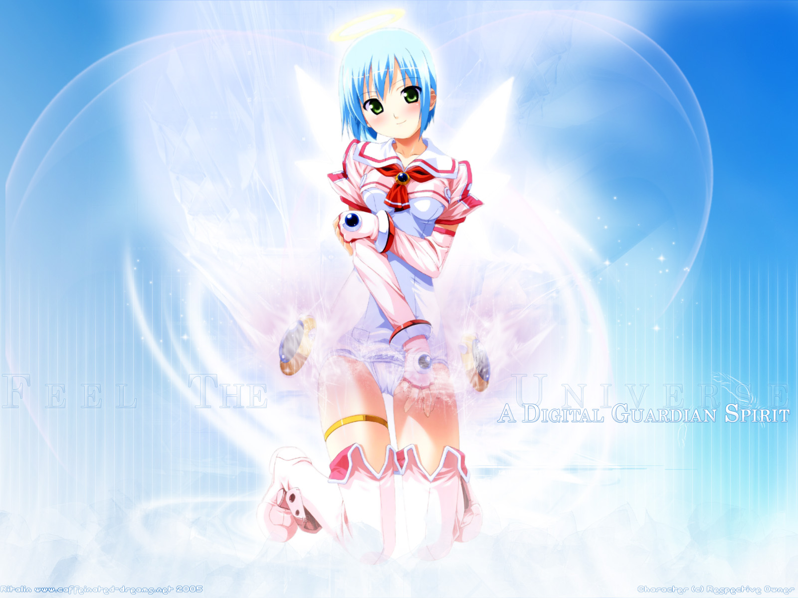 Description: A anime girl sitting on a cloud with a blue background and a pink dress on her knees and a white cat on her lap.