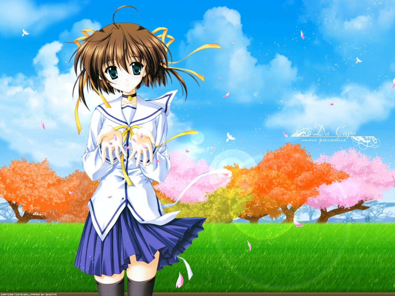 Description: A anime girl in a dress and boots standing in a field with trees in the background and a sky with clouds.