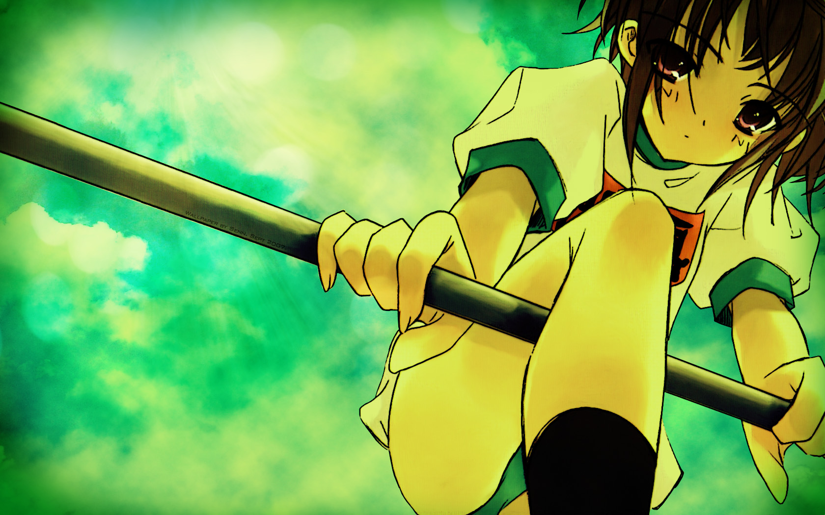 Description: A anime character holding a pole with a green background behind her and a green background behind her.