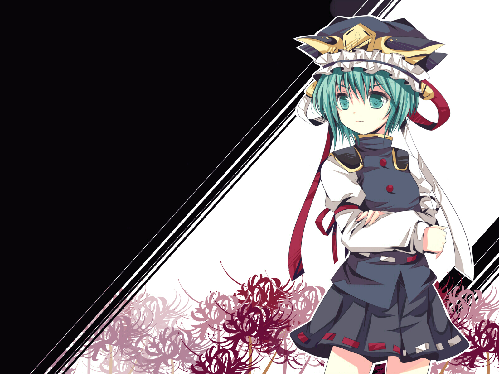 Description: A anime girl with a hat and a dress on standing in front of a black background with a red ribbon.