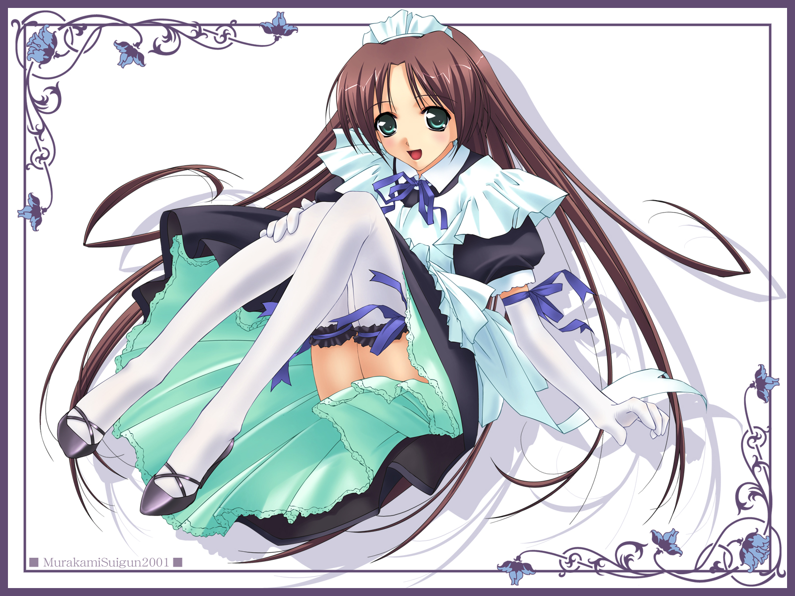Description: A anime girl with long hair and a dress on her knees.