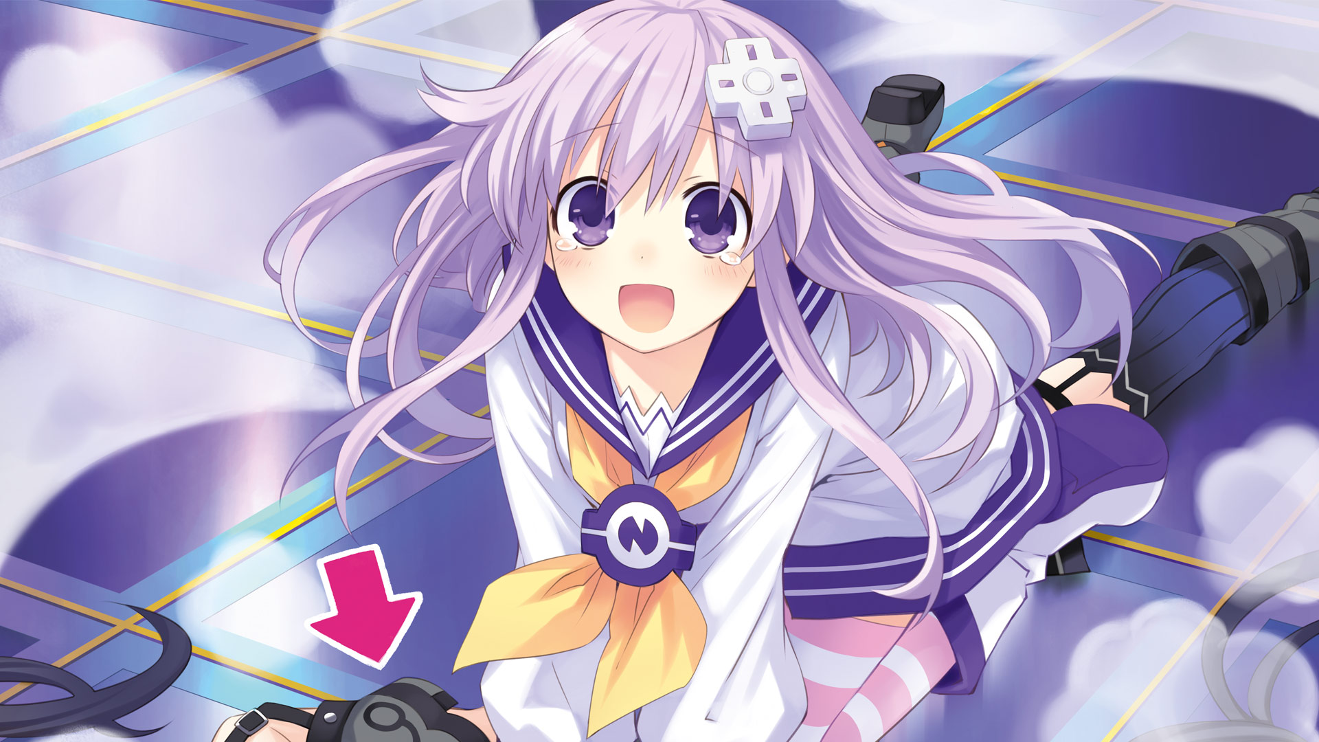 Description: A anime girl with long hair and a purple outfit is flying through the air with a purple umbrella in her hand.