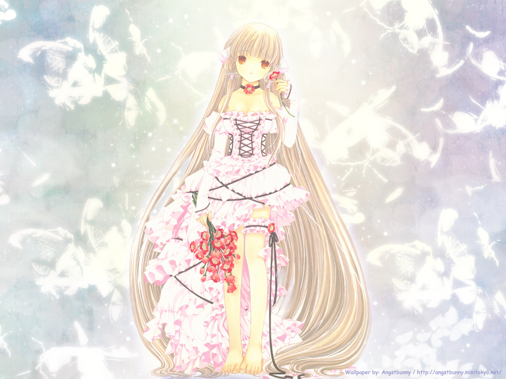 Description: A anime girl with long hair and a dress sitting on a stool with a flower in her hand and a bottle in her hand.