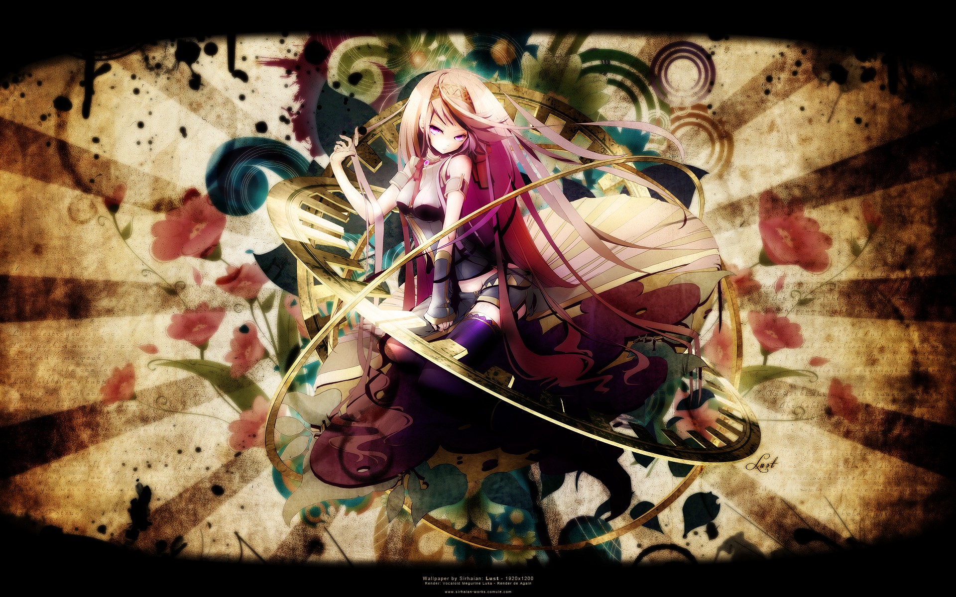 Description: A anime girl with long hair and a pink dress is standing in a floral pattern with a sword in her hand.
