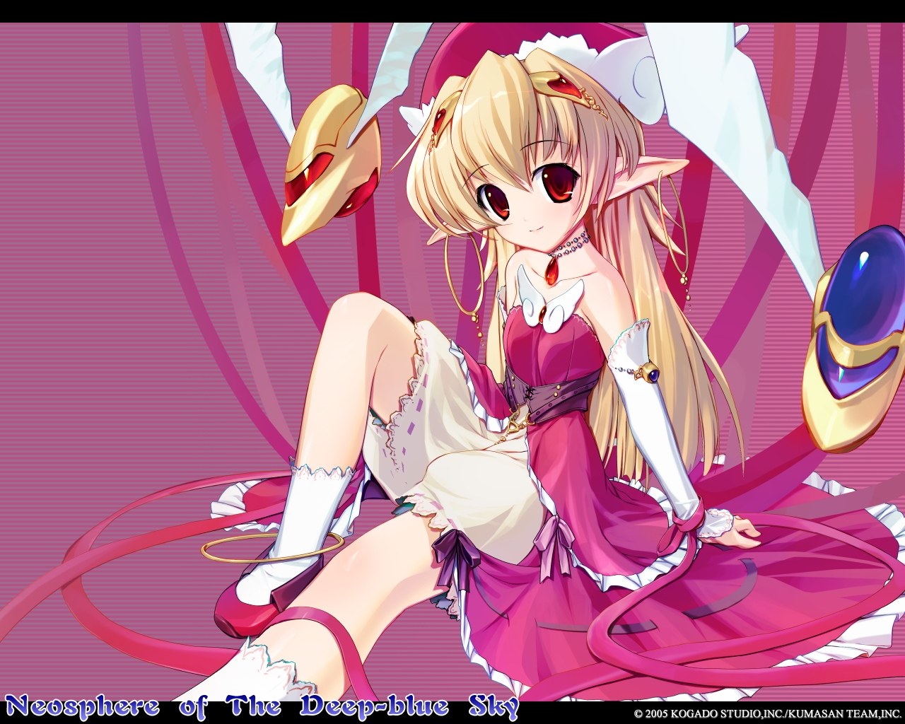 Description: A anime girl in a pink dress with a hat on her head and a sword in her hand.