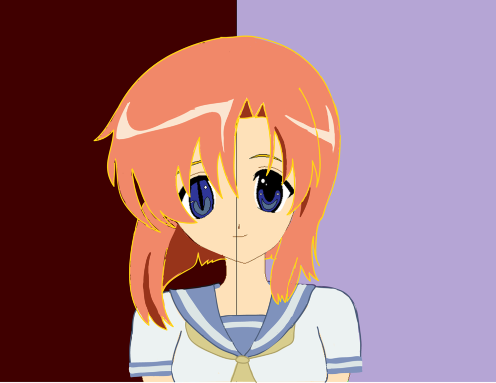 Description: A anime girl with pink hair and blue eyes standing in front of a purple background with a purple background.