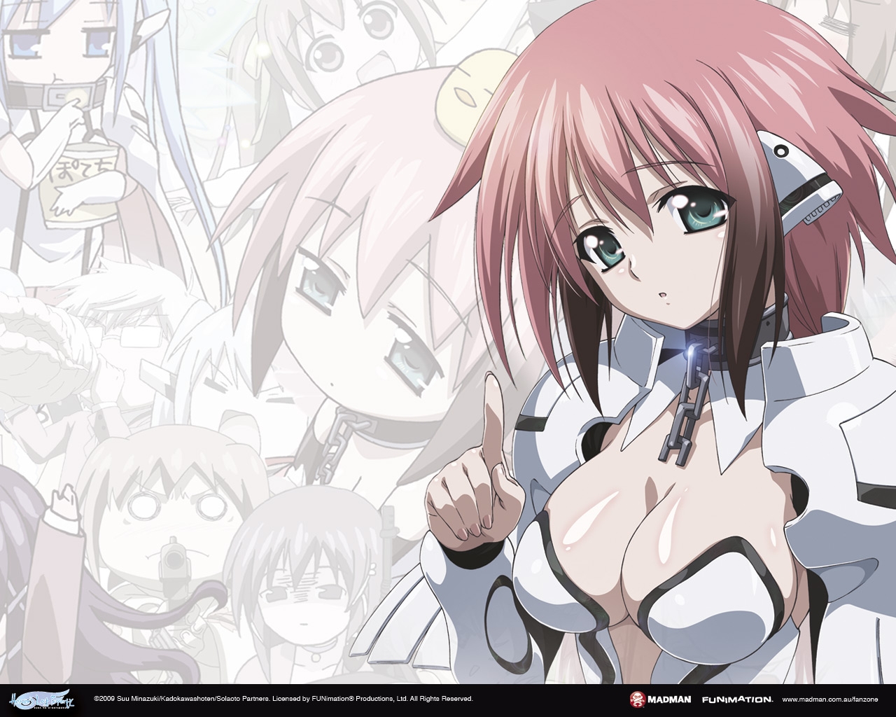 Description: A anime girl with pink hair pointing at something in front of her face and surrounded by other anime characters.