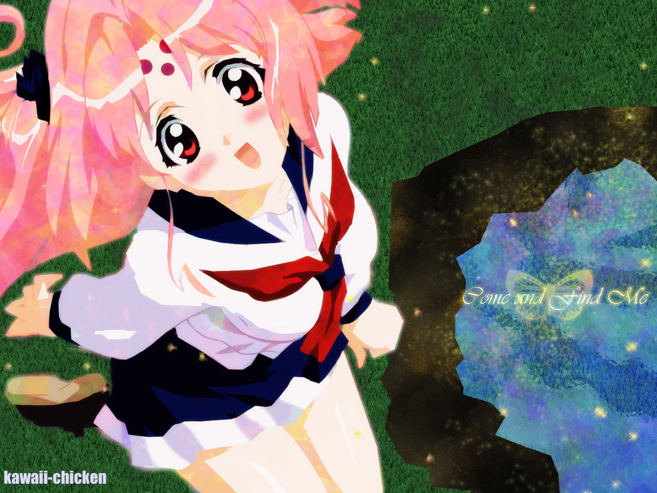 Description: A anime girl with pink hair and a bow tie is standing in the grass with a blue umbrella in front of her.