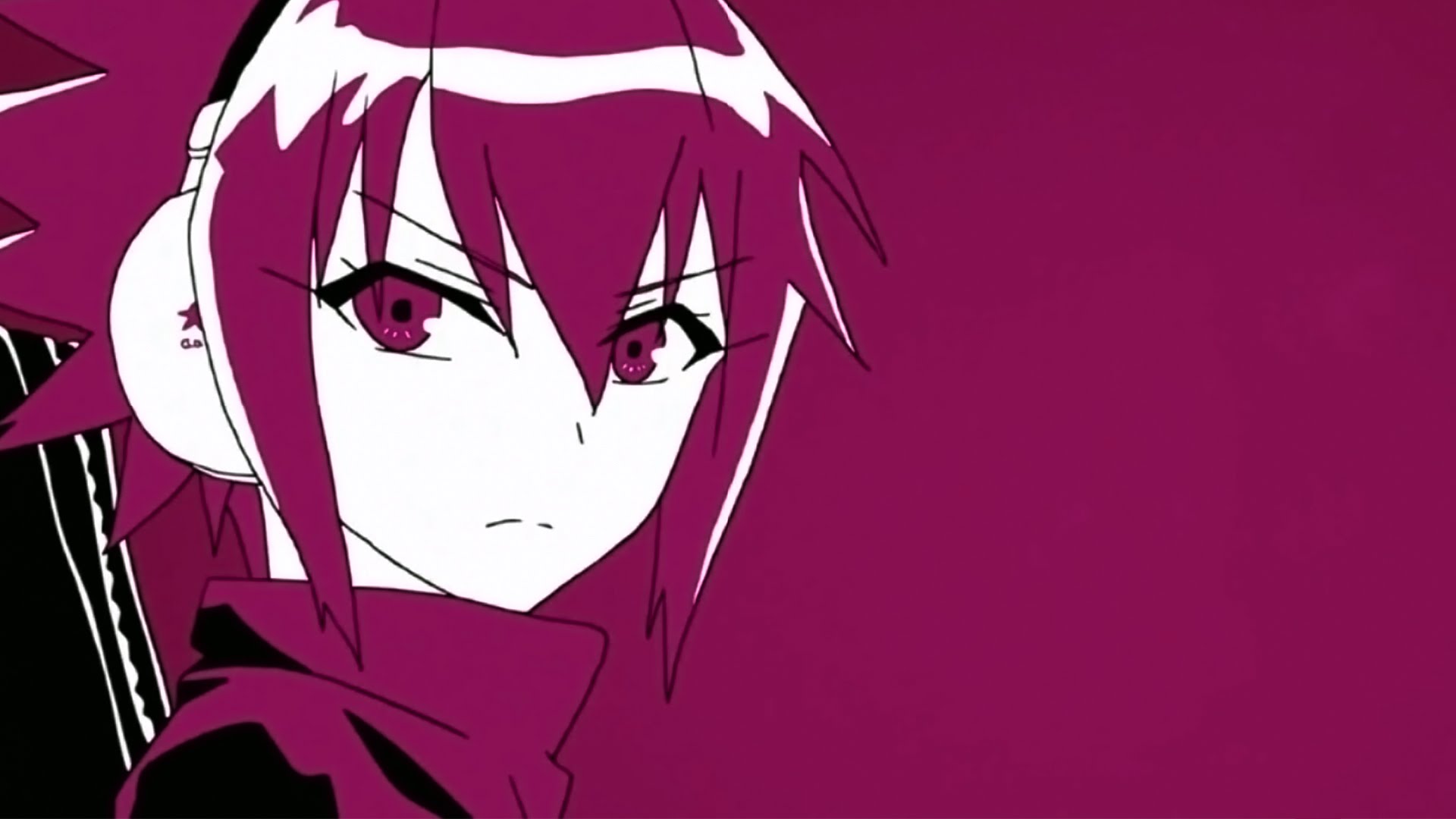 Description: A anime girl with pink hair and a black and white shirt and a pink background with a black and white stripe.
