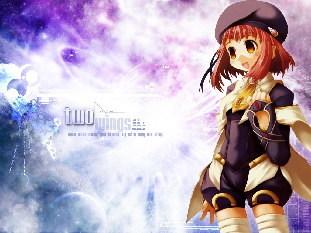 Description: A anime girl in a black outfit and hat with a purple background and a purple and blue background with a white and blue design.