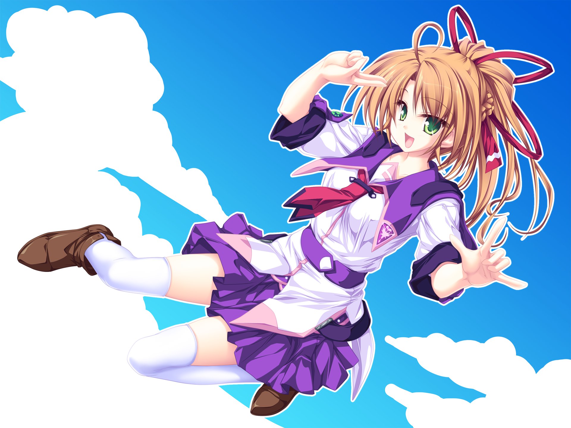 Description: A anime girl in a purple dress flying through the air with her hair in the air and her eyes closed.