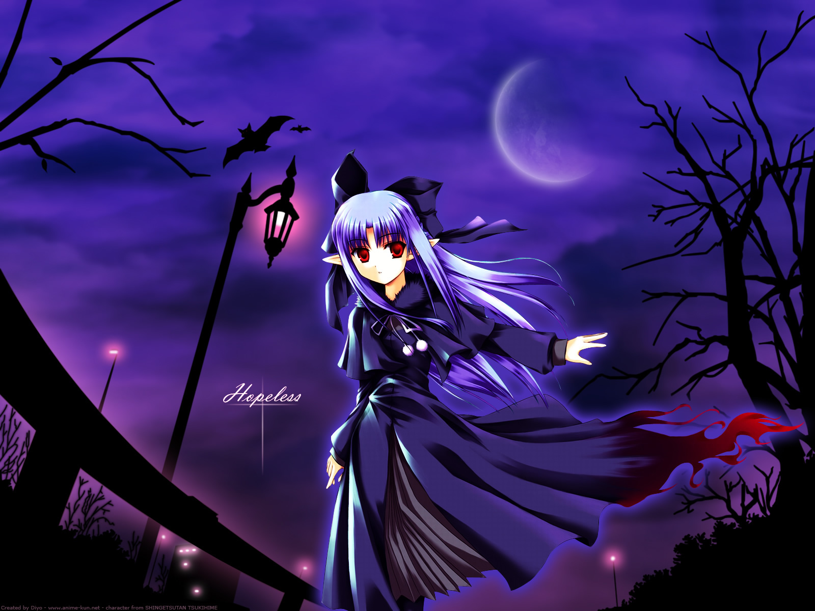 Description: A anime girl in a purple dress and a black cat hat and a full moon in the background with a purple sky.