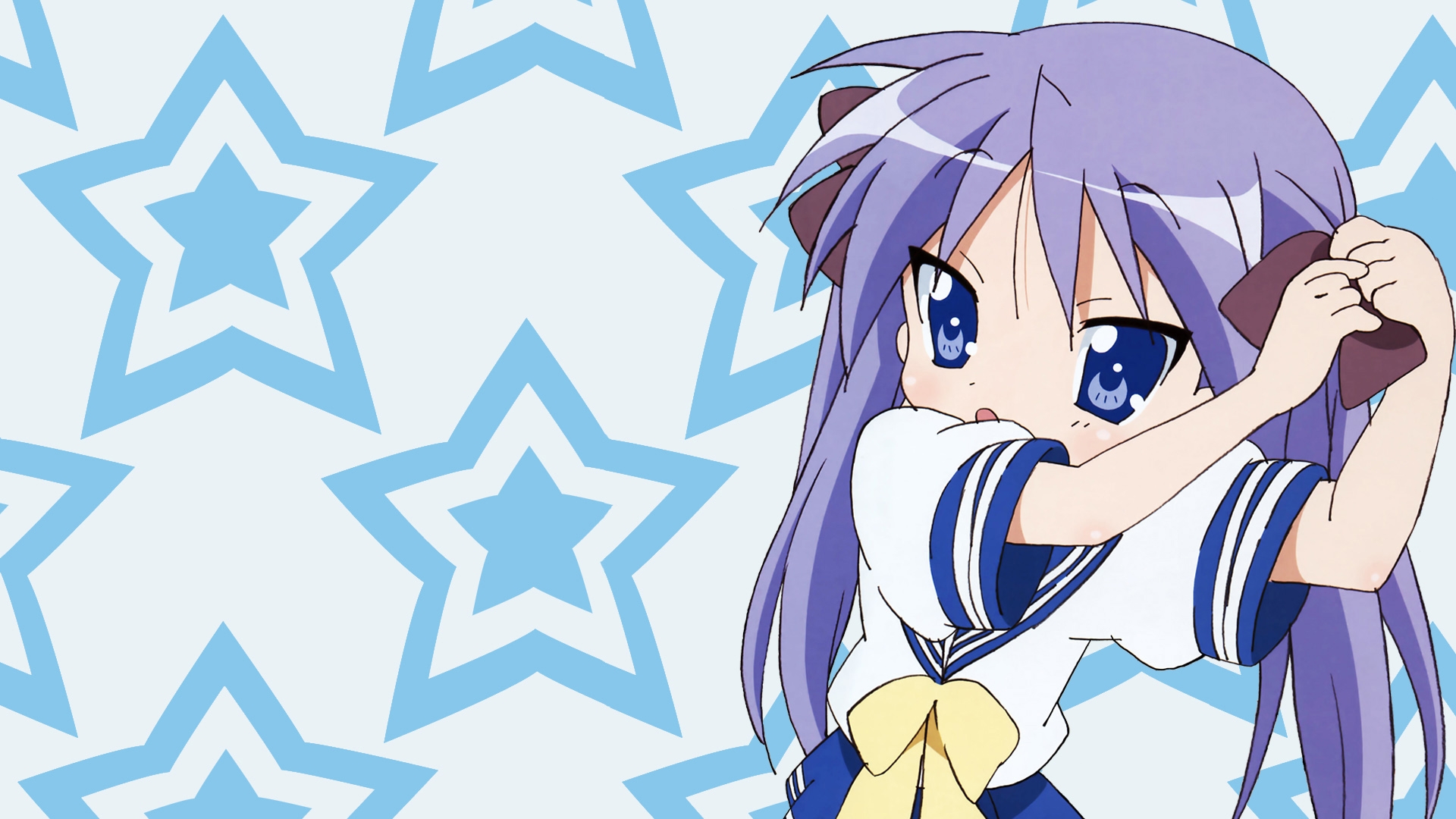 Description: A anime girl with purple hair and blue eyes holding a baseball bat in front of stars and a blue background.