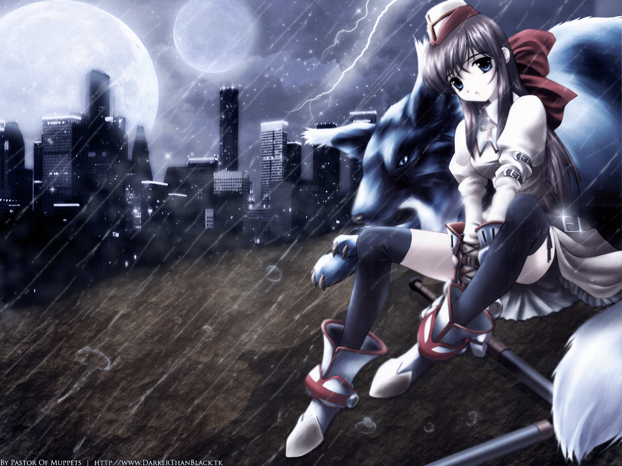 Description: A anime girl sitting on a pole in the rain with a city in the background and a full moon in the sky.