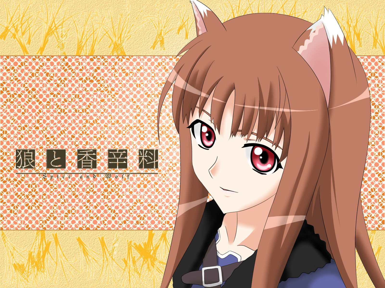 Description: A anime girl with long hair and red eyes with a cat ears on her head and a yellow background.