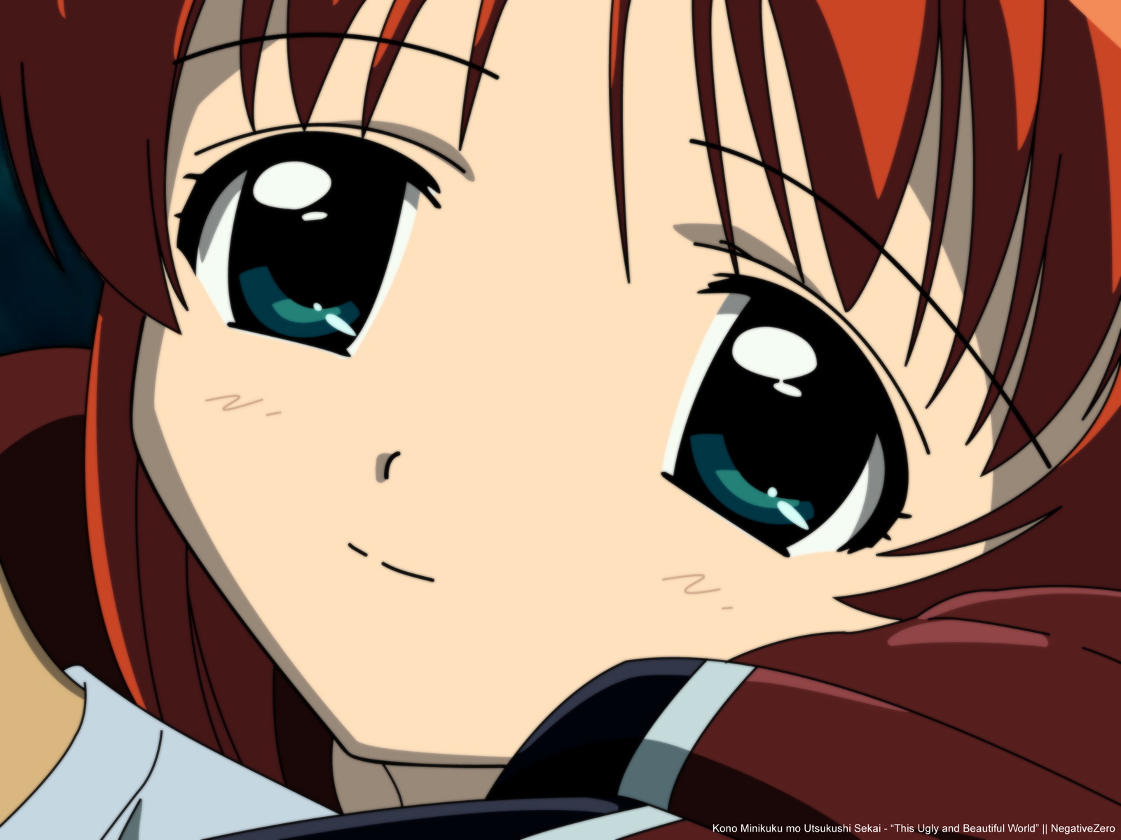 Description: A anime girl with red hair and big eyes looking at the camera with a sad look on her face.
