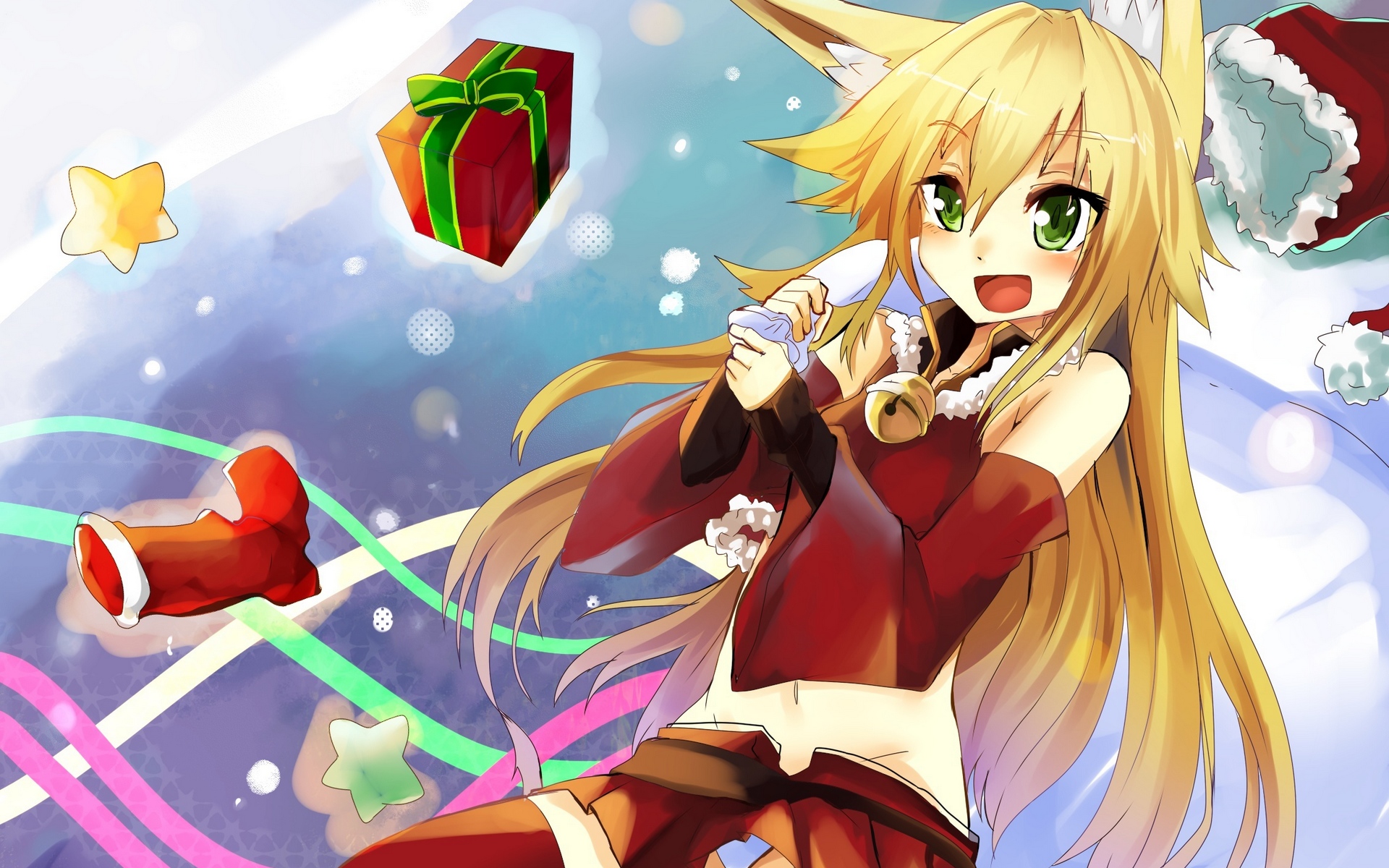 Description: A anime girl in a red dress and santa hat holding a cell phone in her hand and a gift box in the background.