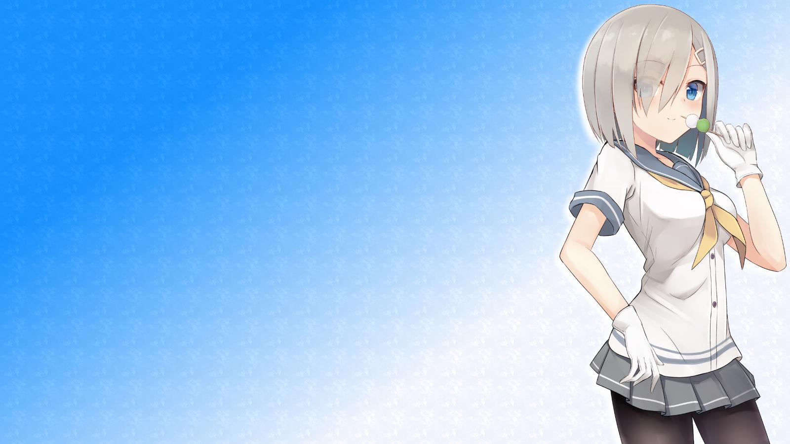 Description: A anime girl with a white shirt and black pants and a blue background with a blue sky in the background.