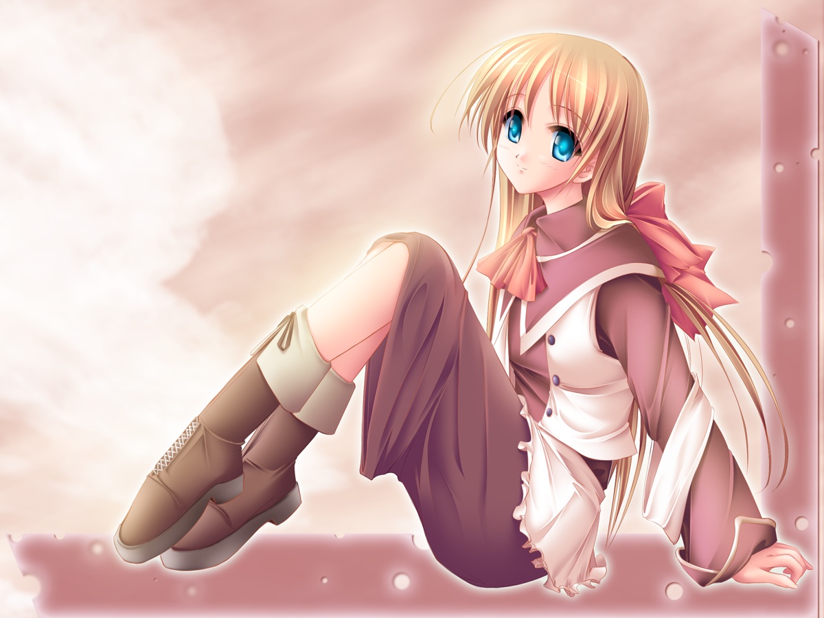 Description: A anime girl sitting on the ground with her legs crossed and her legs crossed.