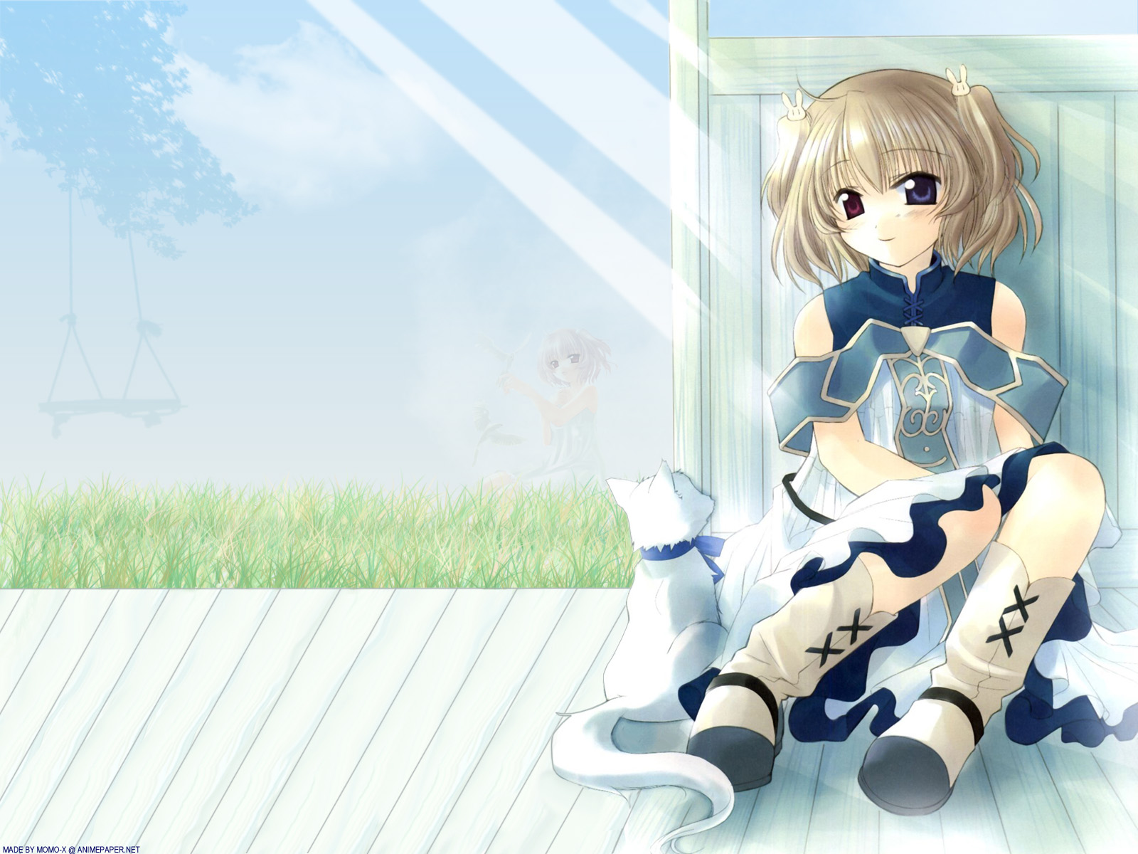 Description: A anime girl sitting on a wooden floor next to a cat and a tree with a swing in the background.