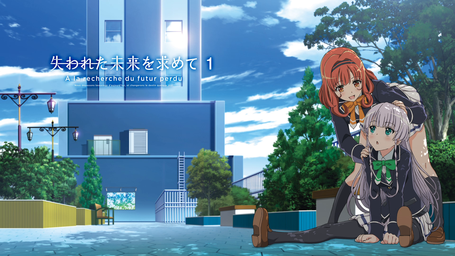 Description: A anime scene with a girl sitting on the ground and a man standing next to her with a green bow tie.