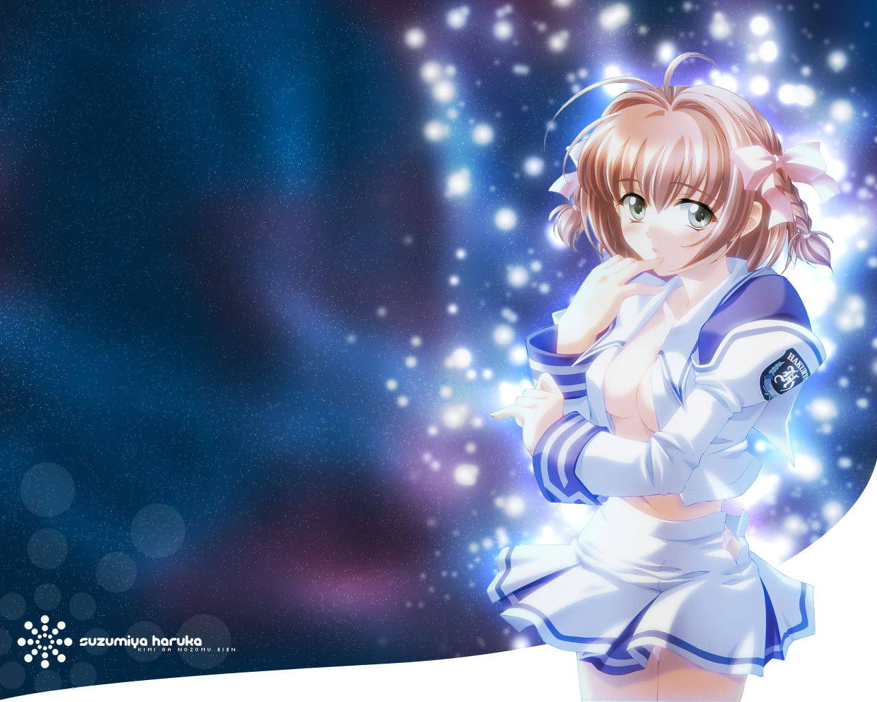 Description: A anime girl with a white dress and blue eyes and a pink hair is standing in front of a blue background.