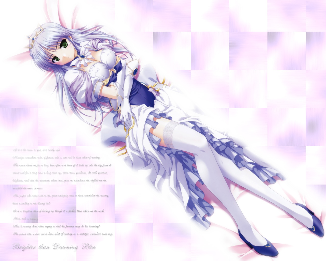Description: A anime girl with long white hair and a blue dress is laying down on a purple background with a white background.