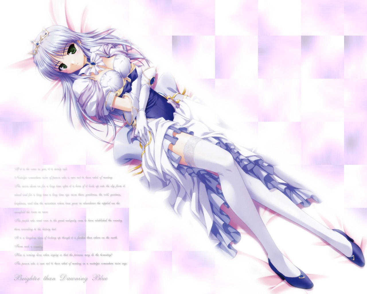 Description: A anime girl with long white hair and a blue dress is laying down on a purple background with a white background.