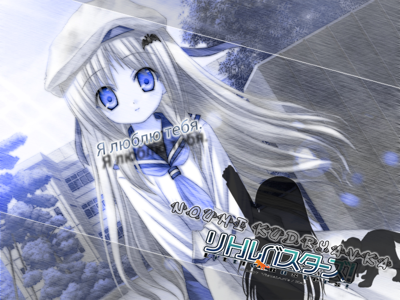Description: A anime girl with long white hair and blue eyes is standing in front of a building with a black cat.