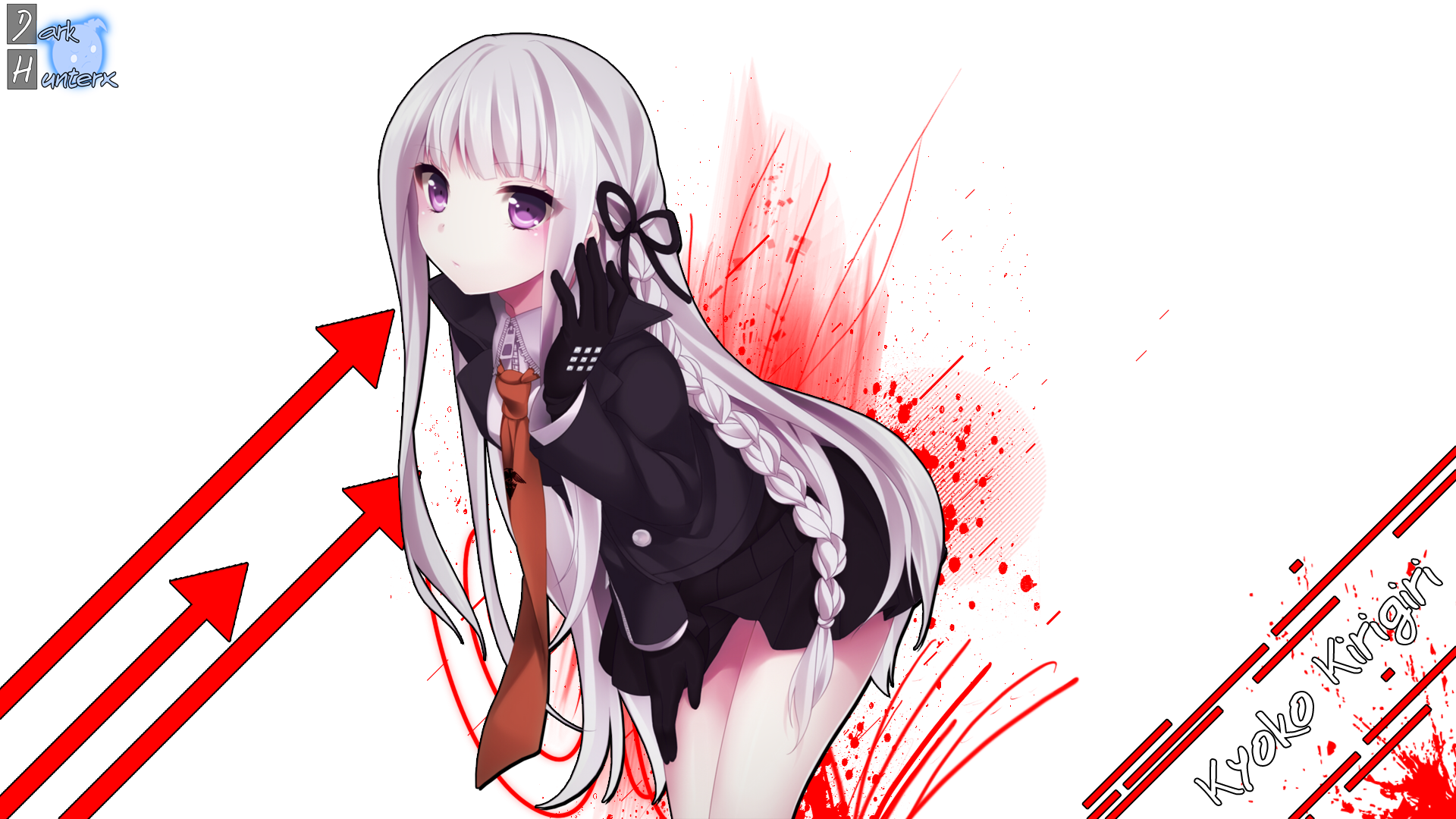Description: A anime girl with long white hair and a black dress with red arrows around her neck and a red arrow pointing up.