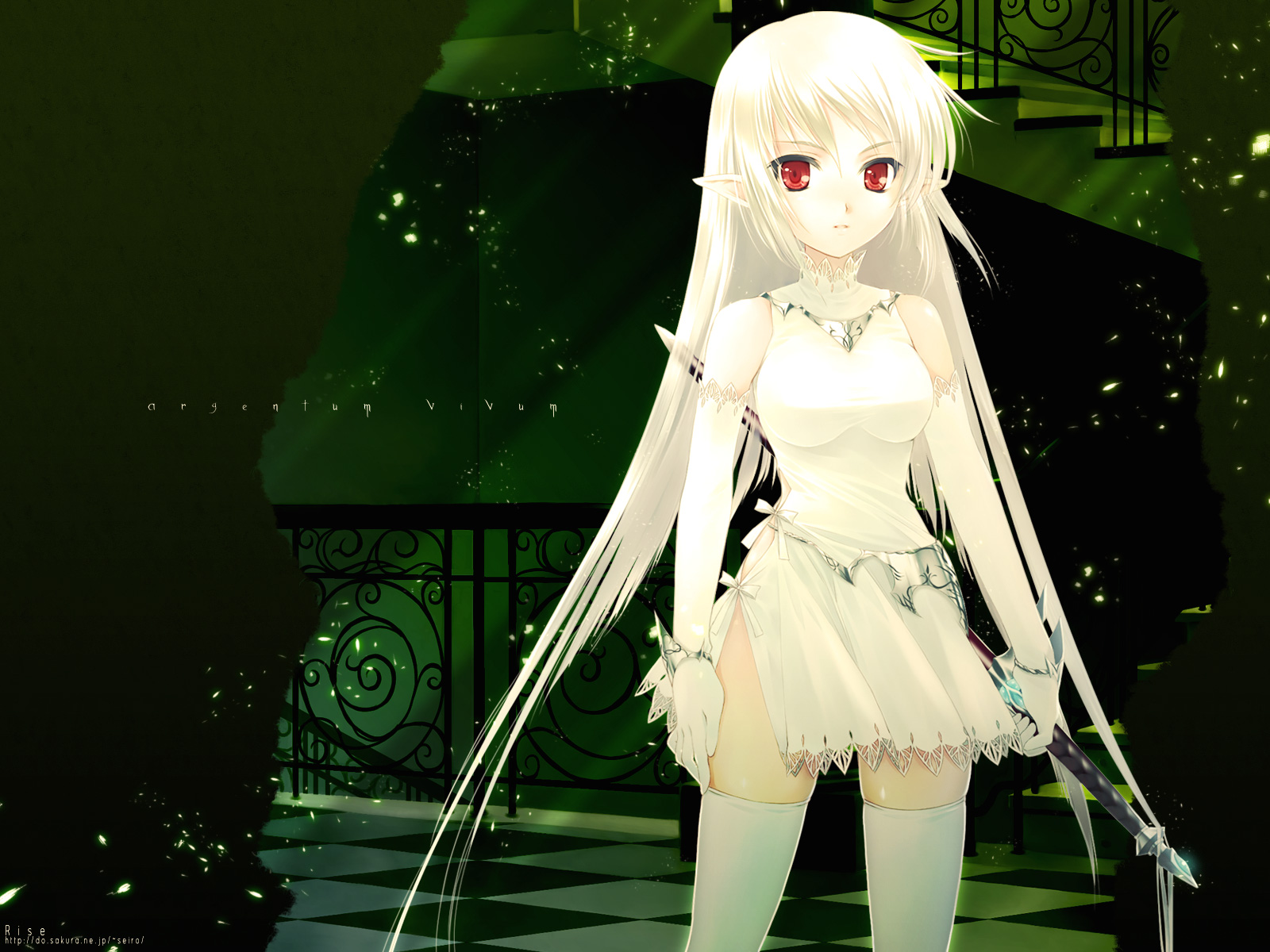 Description: A anime girl with long white hair and red eyes holding a sword in her hand and standing in front of a green background.
