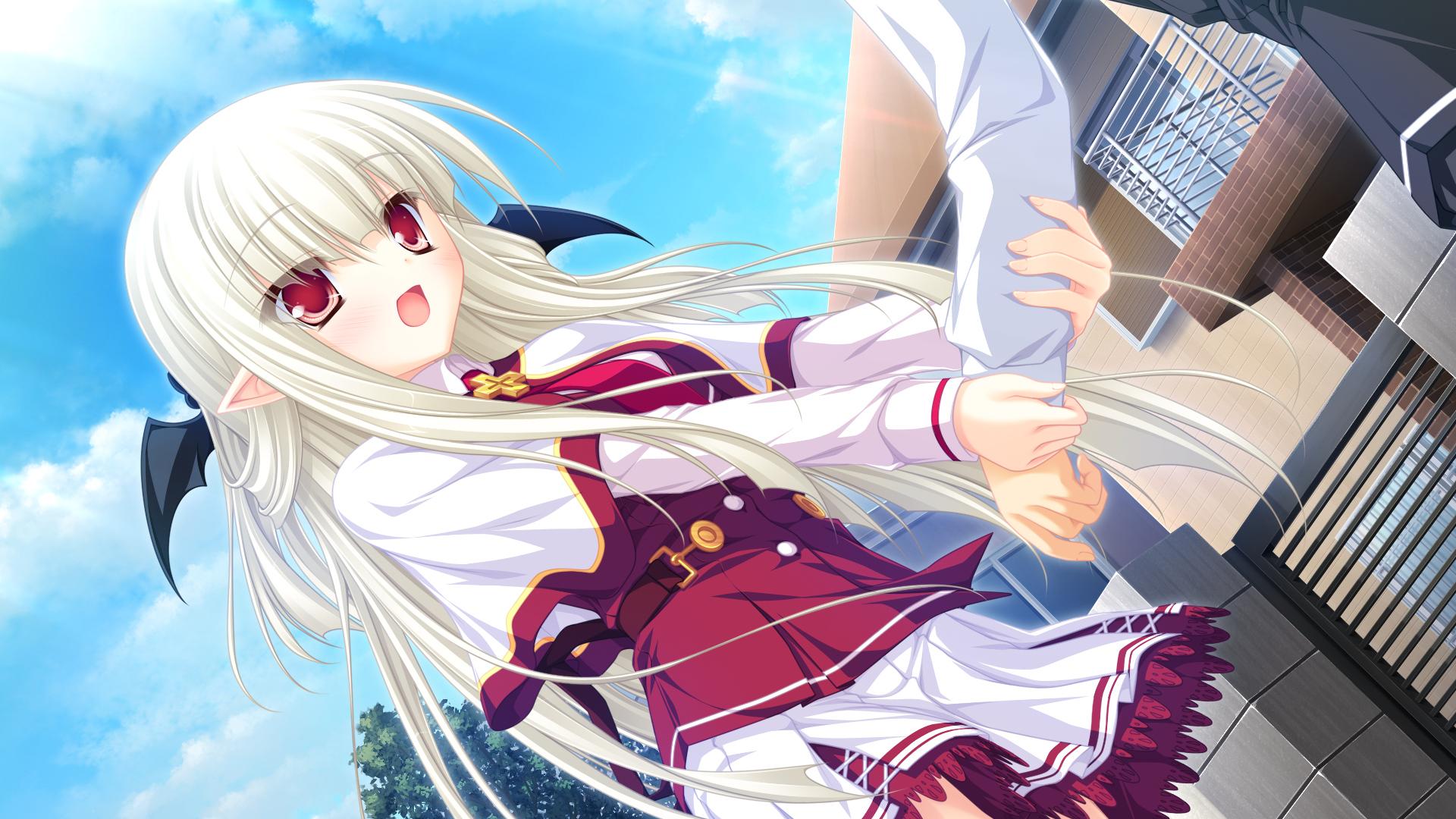 Description: A anime girl with long white hair and red glasses holding a white umbrella in front of a building with a blue sky.