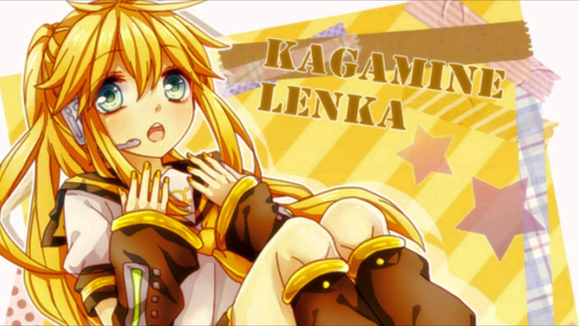 Description: A anime girl with long blonde hair and a yellow dress is talking on a cell phone and has a yellow background.